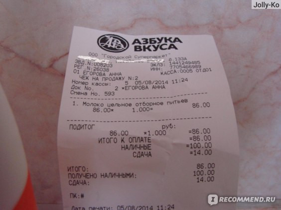 2) По поводу молочной продукции - тут одна девушка писала в другом отзыве что никогда не покупает молоко в "Азбуке Вкуса". А я наоборот, это делаю. Почему? Потому что там можно купить молоко с датой производства этого же дня. Я не знаю, так ли это или на молочных производствах накануне выбивают дату следующего дня, это мне не проверить никак - но, если допустим, сегодня 5 число и вы зашли в "Азбуку Вкуса" то среди молока от разных производителей можете найти молоко с этой же датой, от 5 числа. Вот, например, молоко о котором я ранее писала отзыв. Чек:
