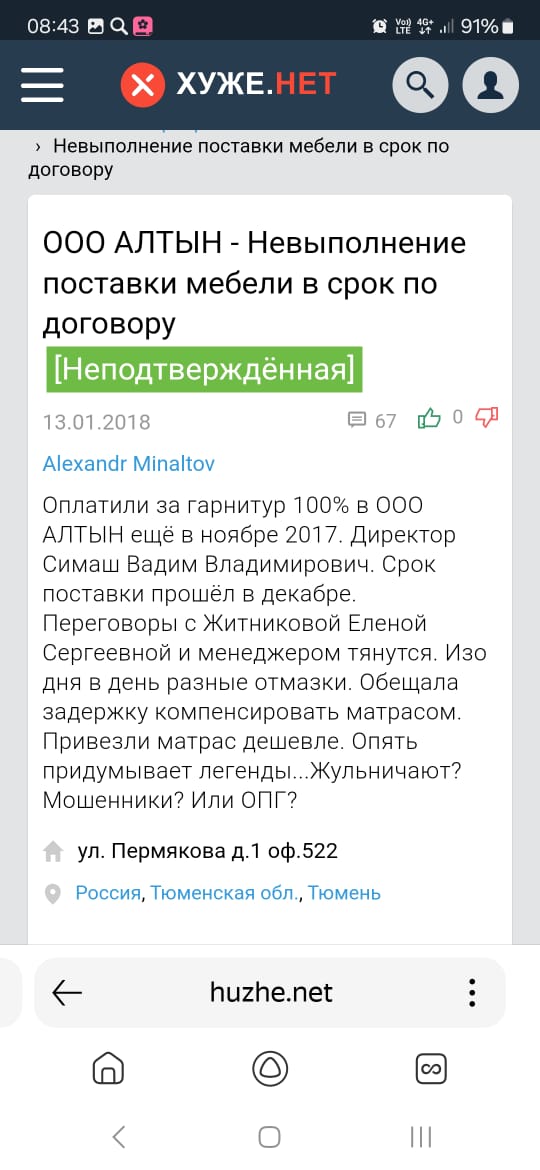 23.10.2024 заказали диван у данной особы. В ТЦ Гулливер. Обещали 15-21 рабочий день на изготовление(у нас был по нашим размерам и в определенной ткани). +20 календарных дней на задержку. 11.12.2024 диван должен был быть у меня по всем срокам. И тут начались каждодневные "завтра", "уточню перезвоню", "уже едет" и т.п. 30.12.2024 нас якобы поставили на доставку, но соответственно ничего не привезли. 31.12.2024 Боголюбова обещает пол дня что диван вот вот приедет. В итоге в середине дня выясняется что мы третьи в очереди на доставку(на тот момент уже было 15:00). Она же предлагает нам скидку и бесплатную доставку. Если мы согласимся подождать до 10.01.2025 (ссылаясь на то что она находится в больнице и у нее завтра операция, именно поэтому она не может решить вопрос дистанционно) при этом говорит "Я сама не понимаю что с вашим диваном, почему его до сих пор не доставили, ведь он приехал еще 3 дня назад" (у меня есть запись разговора). Далек все праздники мы об этом не думаем. 10.01.2025 созваниваемся в Боголюбовой и она говорит ято мо диван на складе в Тюмени. И тут мы поняли что никакого дивана нет. 12.01.2025г. Мы приехали в МЦ Гулливер. Продавец сообщает нам что Боголюбова в г. Краснодар открывает новую точку продаж. Мы пишем претензию на возврат денежных средств. После этого каждый день Боголюбова обещает нам их вернуть. 22.01.2025 она присылает ответ на нашу претензию, где написано ято она обязуется вернуть мои деньги +неустойку за невыполнение условий договора, в течении 10 календарных дней. я пишу отзыв 09.02.2025г., на сегодняшний день мне возвращено 13000 из 24000 которые я заплатила. И больше ничего. Общая вернуть остаток она перестает отвечать на звонки. Я снова еду в МЦ Гулливер ято бы забрать свои деньги. Ее на месте не оказывается, но нас встречает некий Симаш Вадим Владимирович и ведает историю о том что Боголюбова в больнице и чуть ли не при смерти. Начиная выяснять кто такая Боголюбова и с кем же я связалась, выясняется что в прошлом она Житникова Елена Сергеевна и судима по 159 статье в 20и 21 годах. Начиная "копать" дальше выясняется что совместно с эти Вадимом они уже много лет обманывают людей в разных городах. Так же нашла 12 пострадавших так же заплативших им от 7 до 100 т.руб из разных городов (Екатеринбург, Тюмень, Нижний Тагил, Краснодар.) И мы продолжаем искать кого она обманула. Просим связаться по почте: Katerina.cropacheva@yandex.ru