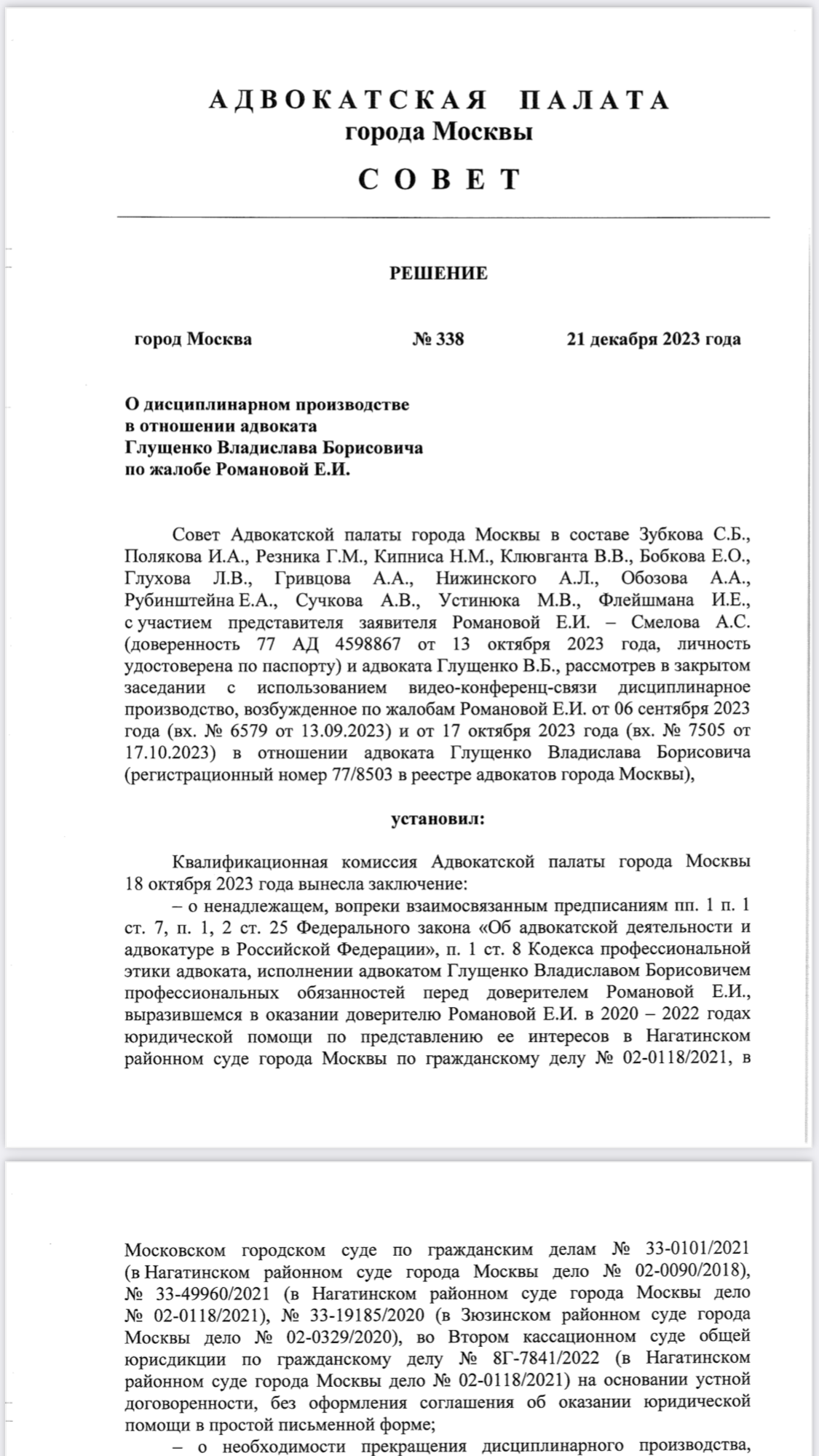 Прочла отзывы об адвокате Глущенко Владиславе Борисовиче, отзывы великолепные, просмотрела сайт Адвокатской палаты города Москвы, решения нашла, Совет палаты во всем прав! Увидела в решениях как он забирает чужое, сделала вывод - ВОР, понаблюдала как он не заключает соглашения с клиентами, сделала вывод - АФЕРИСТ, задалась мыслью, почему он не заключает соглашения с клиентами, поняла прямую связь с неуплатой налогов, сделала повторный вывод - ВОР! Заметила в решениях, что он не признает получение от клиентов наличных, снова напросился вывод - ВОР, пристально обратила внимание, где в решениях он постоянно, как минимум 3 раза, просит прощения и признает вину, вывод немного обновленный - СИСТЕМАТИЧЕСКИЙ ВОР, он никогда не остановится воровать, его ничто не остановит, у него это природно в крови! благодарю всех за отзывы, прилагайте больше документов, в них все подтверждено и заложено, прочла документы и сделала вывод - ЭТО НЕ АДВОКАТ, который даже не достоин звания - НЕ АДВОКАТ, а уж звания - адвокат и подавно, жизнь его воспитает в ближайшее время, горбатого как говорят - могила исправит. Всех благодарю за отзывы, большое вам спасибо, пишите подробно и чаще! С Уважением к авторам отзывов, с презрением к псевдоадвокату глущенко владиславу борисовичу из Невинномысска. Вот восхитительное решение об этом.