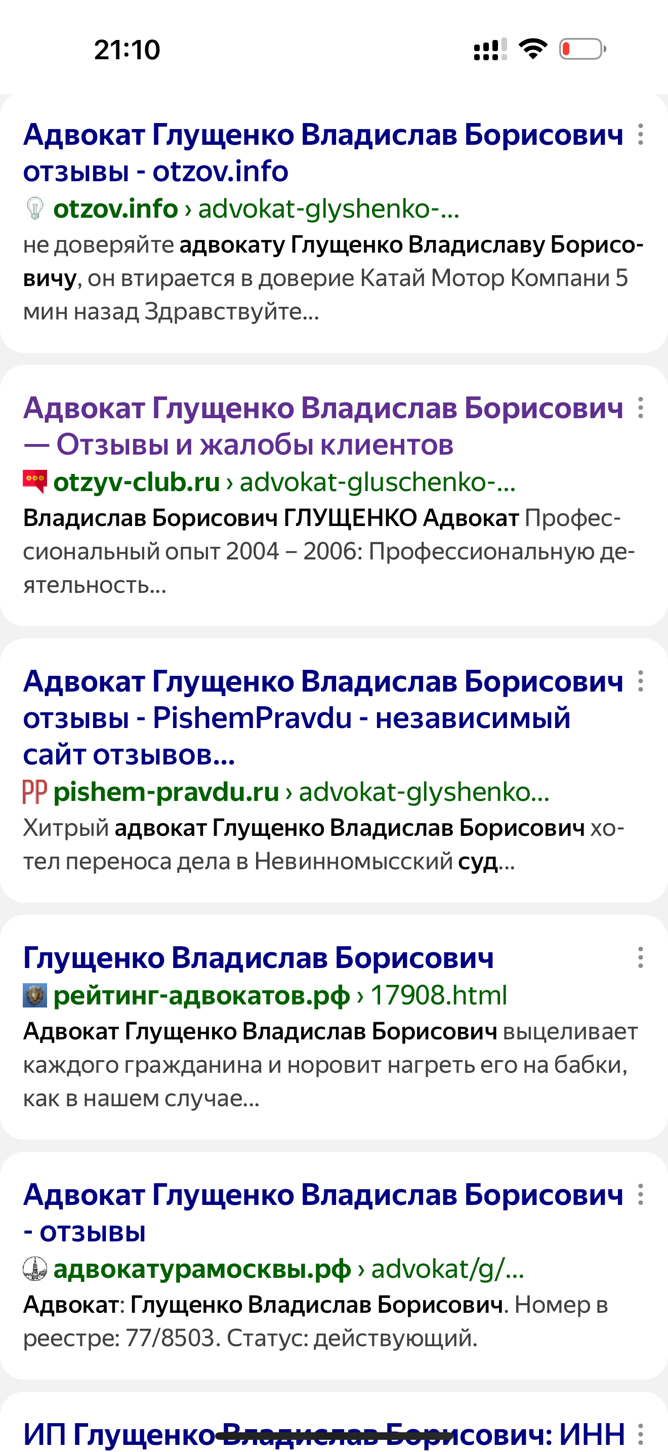 Ну и как с такими отзывами вообще ходить в суды, работать с клиентами, осуществлять прием клиентов и консультации? Да каждый гражданин увидев такие отзывы, рванет в противоположную сторону от адвоката Глущенко В.Б., мой отзыв аналогичный - это мошенник низкого класса, вводит в заблуждение людей и кидает на де... Читать полностью